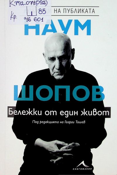 ЦБ 46601 ШОПОВ, Наум Христов Бележки от един живот : [Мемоари на актьора] / . - София : Книгомания, 2020 ([София] : печ. Дедракс). - 184 с. : със снимки ; 21 см. - (Поредица Любимци на публиката) Др. ил.: И. Хаджимишев, Б. Марков, А. Кънчев ; Пълната форма на името на ил. А. Кънчев е Атанас Кънчев Атанасов. - С биогр. данни за авт. на кор. - Съдържа и Роли: с. 167-179. ISBN 978-619-195-254-0 Сист. N: 151875 |