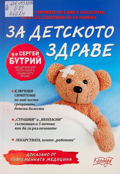 ЦБ 46624 БУТРИЙ, Сергей За детското здраве : Как да се справяте не само с болестите, но и със собствената си паника / . - София : Колхида, 2020 ([София] : печ. Алианс Принт). - 236 с. : с ил. ; 23,5 см Съдържа и Български Национален имунизационен календар ; Индекс на детските болести, лекарствата и медицинските термини. ISBN 978-954-672-259-1 Сист. N: 151907 |