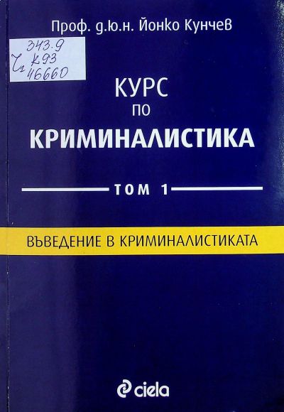 ЦБ 46660 КУНЧЕВ, Йонко Димитров Курс по криминалистика : [Учебник за ВУЗ] : Т. 1 - / . - София : Ciela, 2020 -.- 21 см С кратки биогр. данни за авт. на кор. Т. 1. Въведение в криминалистиката / : Ciela, 2020. - 424 с. : с ил. Библиогр.: с. 408 - 423 и под линия. ISBN 978-954-28-3122-8 (т. 1) (Сиела) Сист. N: 151939 |