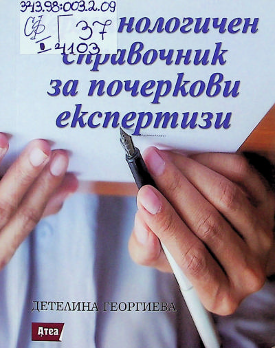 ЦБ I 4103 ГЕОРГИЕВА, Детелина Людмилова Терминологичен справочник за почеркови експертизи / . - [София] : Атеа Букс, 2017. - 127 с. ; 14 см Името на прев. е отбелязано на гърба на загл. с. ; Съдържа и: За авт.: с. 127 ; Библиогр.: с. 122-126 ; Азб. показалец: 98-117. ISBN 978-619-7280-51-7 Сист. N: 152187 |