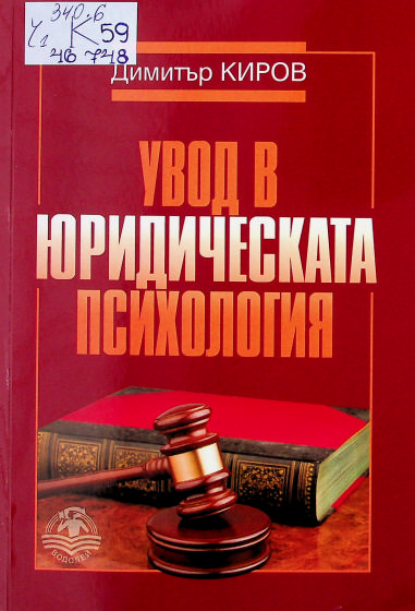 ЦБ 46748 КИРОВ, Димитър Михайлов Увод в юридическата психология : За юристи и психолози, обучаващи се в магистърски прогр. по юридическа психология / Димитър Киров ; Предисл. Роза Димитрова. - София : Водолей, 2020. - 400 с. ; 21 см С биогр. и библиогр. данни за авт. на кор. - Библиогр.: с. 386-390. ISBN 978-619-7533-04-0 Сист. N: 154550 |