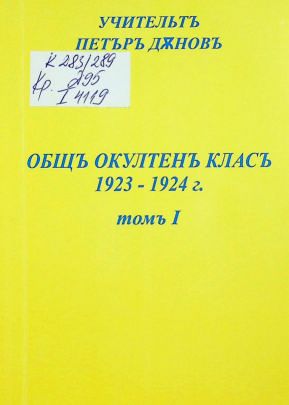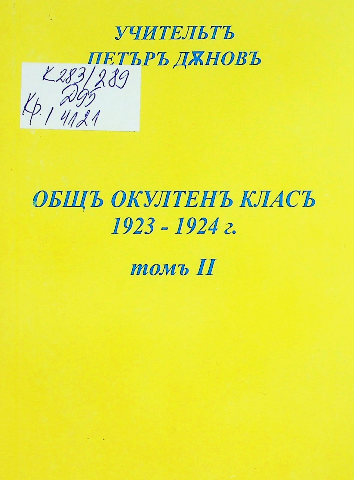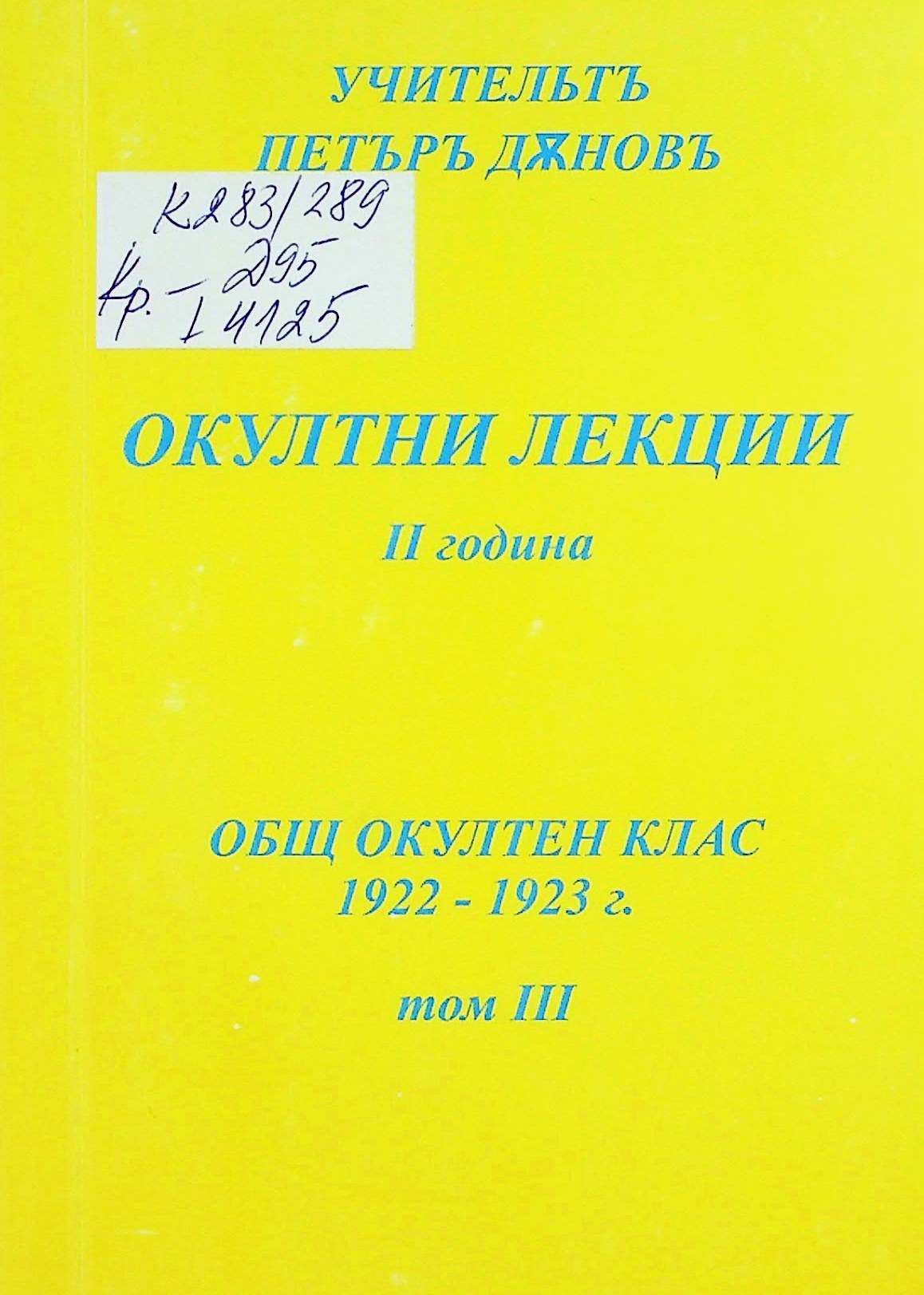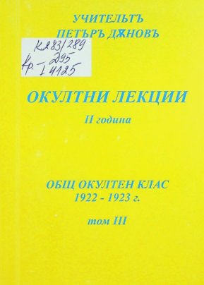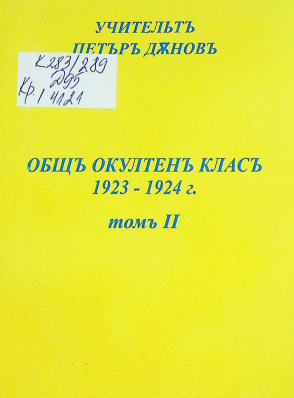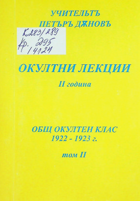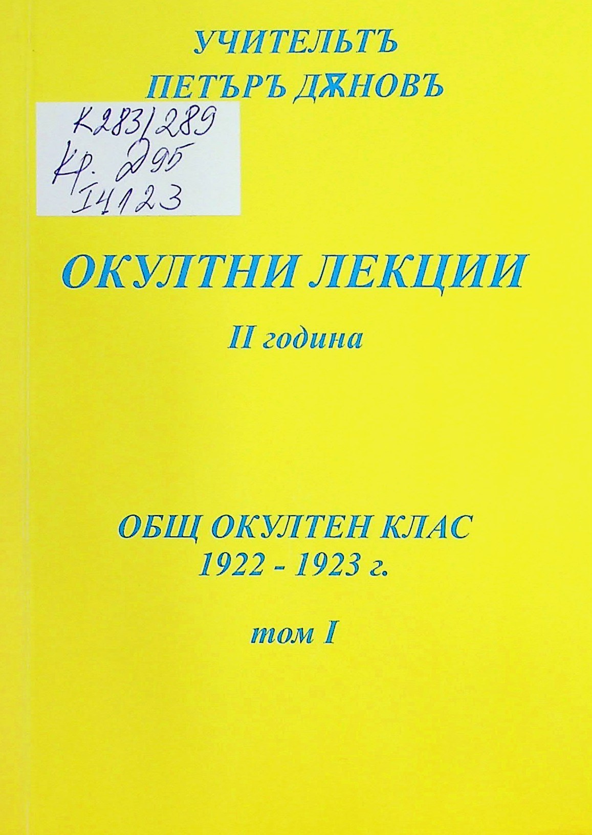 ЦБ I 4123 ДЪНОВ, Петър Константинов Окултни лекции дадени на учениците на Всемирното Бяло братство : Общ окултен клас : II година, София, 1922-1923 г. : Т. 1. / . - Фототип. изд.- Ст. Загора : Кота, 2019. - 320 с. ; 16 см Загл. и текст на стар правопис ; На кор.: Окултни лекции II година : Общ окултен клас 1922-1923 г. ; т. I. ISBN 978-954-305-489-3 Сист. N: 153017 |