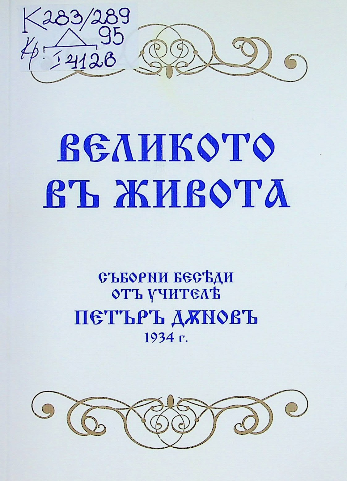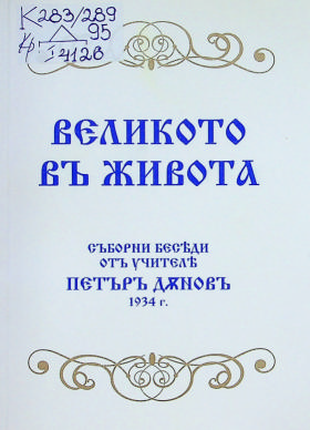 ЦБ I 4126 ДЪНОВ, Петър Константинов Великото в живота : Съборни беседи отъ Учителя[, държани август] 1934 [на Витоша, Яворови присои] / Учителя Петър Дънов. - 2. фототип. изд.- Ст. Загора : Кота, 2020 ([Ст. Загора : печ. Кота]). - 64 с. ; 16 см Беинса Дуно псевд. на Петър Константинов Дънов. - Фототип. изд.: София, 1934 г., загл. и текст на стар правопис. ISBN 978-954-305-546-3 Сист. N: 154609 |