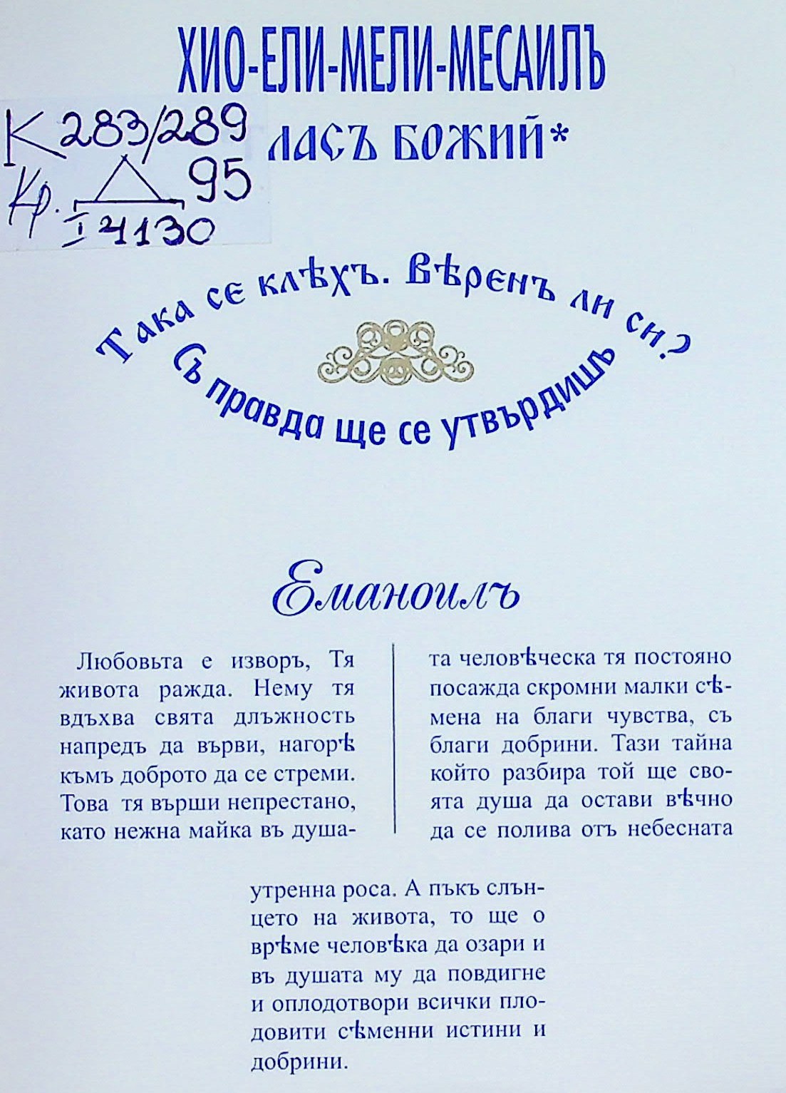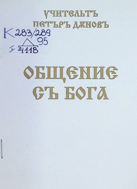 ЦБ I 4130 ДЪНОВ, Петър Константинов Хио-Ели-Мели-Месаилъ / Учителят Петър Дънов. - [Фототип. изд.]. - Ст. Загора : Кота, 2020. - 40 с. ; 16 см Беинса Дуно псевд. на Петър Константинов Дънов. - Фототип. изд.: Бургас, 1900 г., загл. и текст на стар правопис. ISBN 978-954-305-545-6 Сист. N: 154610 |