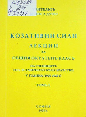 ЦБ I 4127 ДЪНОВ, Петър Константинов Козативни сили : Лекции за общия окултен клас на учениците от на Всемирното Бяло братство V год. (1925-1926 г.) : Т. 1. / . - Фототип. изд.- Ст. Загора : Кота, 2020. - 245 с. ; 16 см Загл. и текст на стар правопис. - Фототип. изд. на кн. от 1930 г. ISBN 978-954-305-562-3 Сист. N: 153020 |