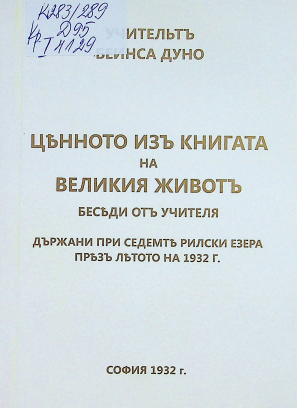 ЦБ I 4129 ДЪНОВ, Петър Константинов Ценното из книгата на Великия живот : Беседи от учителя държани при Седемте рилски езера през лятото на 1932 г. / . - Фототип. изд.- Ст. Загора : Кота, 2020. - 416 с. ; 16 см Учителят Беинса Дуно - духовно име на Петър Константинов Дънов. - Фототип. изд.: София, 1932 г., загл. и текст на стар правопис. ISBN 978-954-305-563-0 Сист. N: 153028 |