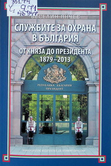 ЦБ 46947 ЯНЧЕВ, Веселин Костов Службите за охрана в България от княза до президента : 1879-2013 / . - София : Унив. изд. Св. Климент Охридски, 2013. - 224 с., [48 с.] : цв. ил., портр., факс. ; 21 см Библиогр. под линия. ISBN 978-954-07-3637-2 Сист. N: 153170 |