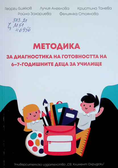 ЦБ 46956 МЕТОДИКА за диагностика на готовността на 6 - 7-годишните деца за училище / . - София : Унив. изд. Св. Климент Охридски, 2020. - 207 с. : с ил., табл. ; 23 см Други авт.: Лучия Ангелова, Кристина Танева, Райна Захариева, Фелиянка Стоянова. Рец. Божидар Ангелов. - Съдържа и Стандартизирани методики за диагностика на готовността на 6 - 7-годишни деца за училище. - Библиогр.: с. 192-200. ISBN 978-954-07-5066-8 Сист. N: 153216 |