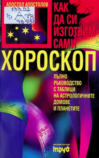 ЦБ 46931 АПОСТОЛОВ, Апостол Христов Как да си изготвим сами хороскоп : Пълно ръководство с табл. на астрологичните домове и планетите / Апостол Апостолов. - София : Труд, 1998. - 224 с. : с табл., сх. ; 20 см ISBN 954-528-093-X Сист. N: 154614 |