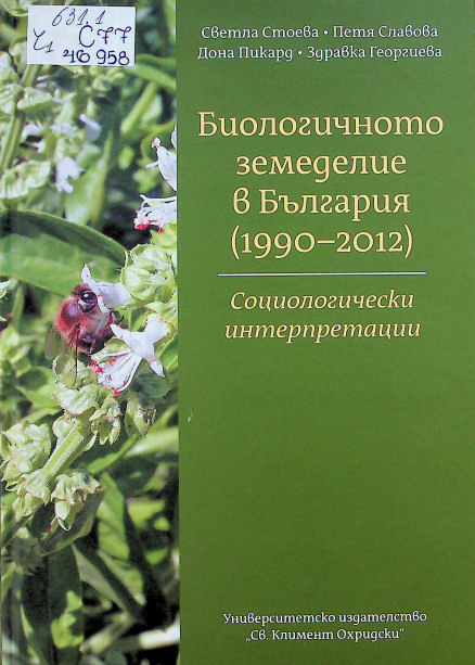 ЦБ 46958 СТОЕВА, Светла Чавдарова и др. Биологичното земеделие в България (1990-2012) : Социол. интерпретации / Светла Стоева и др. - София : Унив. изд. Св. Климент Охридски, 2016. - 200 с. ; 24 см Др. авт.: П. Славова, Д. Пикард, З. Георгиева ; Съдържа и: За авт.: с. 7-9. - Библиогр. след отд. статии. ISBN 978-954-07-4131-4 Сист. N: 154623 |