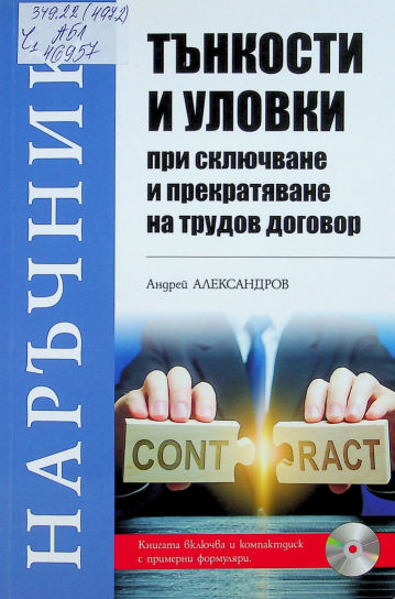 ЦБ 46957 АЛЕКСАНДРОВ, Андрей Сашов Тънкости и уловки при сключване и прекратяване на трудов договор : Наръчник / Андрей Александров ; С въвед. от авт. - 3. доп. изд.- София : Резон-България, 2021. - 320 с. ; 21 см + 1 CD Кн. вкл. и диск с примерни формуляри CD-R 012105. - С кратки биогр. данни за авт. на гърба на кор. ISBN 978-619-7236-45-3 Сист. N: 154625 |