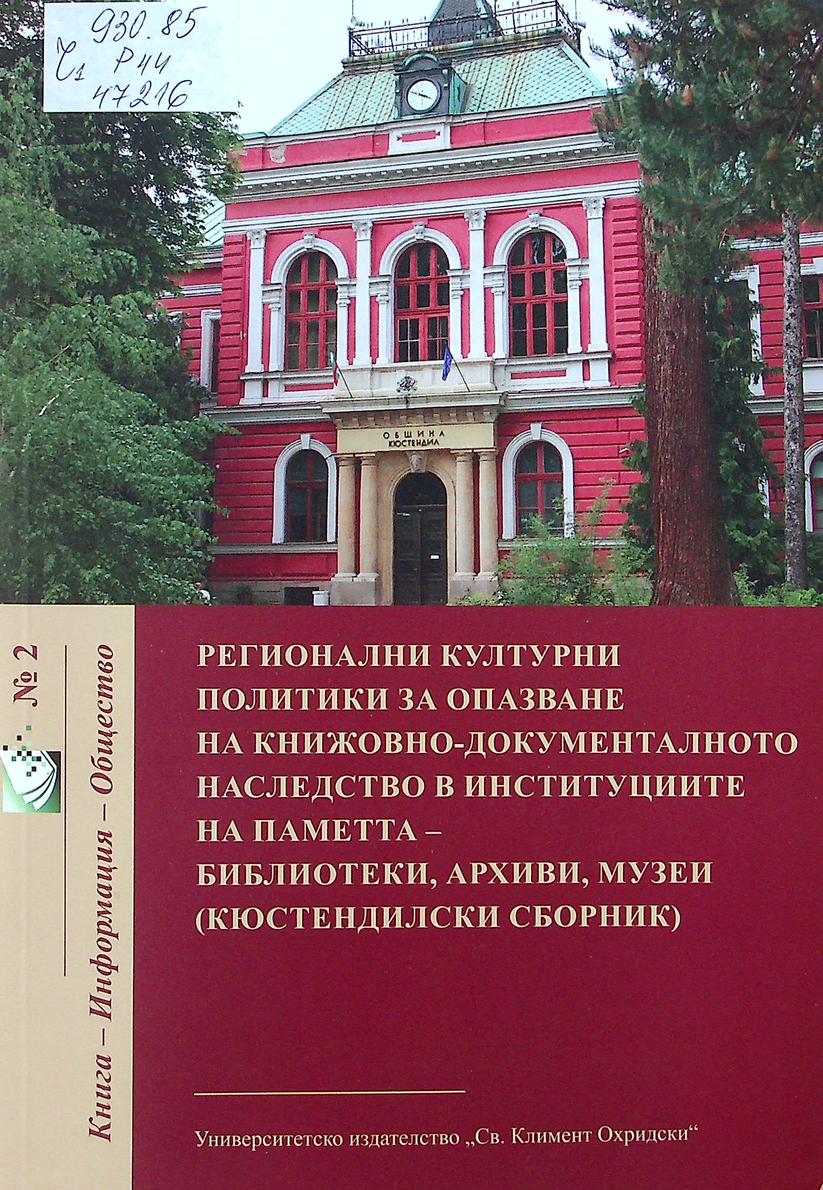 ЦБ 47216 РЕГИОНАЛНИ културни политики за опазване на книжовно-документалното наследство в институциите на паметта - библиотеки, архиви, музеи (Кюстендилски сборник) : Сб. с докл. от кръгла маса, Кюстендил, 21-22 октомври 2019 г. = Regional cultural policies in preservation and conservation of literaly heritage in the institutions of memory - libraries, archives, museums, (Kyustendils' book) : Proceedings of the Round Table. - Ed. Aneta Doncheva / Състав. Анета Дончева ; Науч. ред. Цветанка Панчева ; Предг. София Пейчева, Анета Дончева = Regional cultural policies in preservation and conservation of literaly heritage in the institutions of memory - libraries, archives, museums, (Kyustendils' book) : Proceedings of the Round Table / Ed. Aneta Doncheva. - София : Унив. изд. Св. Климент Охридски, 2020. - 247 с. : с ил., факс. ; 24 см. - (Поредица Книга - Информация - Общество / Науч. ред. Цветанка Панчева, ISSN 2683-0515 ; 2) Съдържа докл. от А. Дончева, Е. Попова, К. Даскалова, М. Миланова, Ц. Панчева, Г. Петров, П. Миладинов, Н. Карачоджукова, Д. Боев, М. Аврамова, И. Стоянова, И. Мавродиева, С. Недков, Д. Лилова, С. Пейчева, З. Николова, Р. Петрова, В. Димитрова, Б. Козарева. - Библиогр. след отд. докл. ; Рез. на бълг., англ. ез. ; Сп. на авт.: с.245-246. ISBN 978-954-07-5118-4 Сист. N: 70668 |