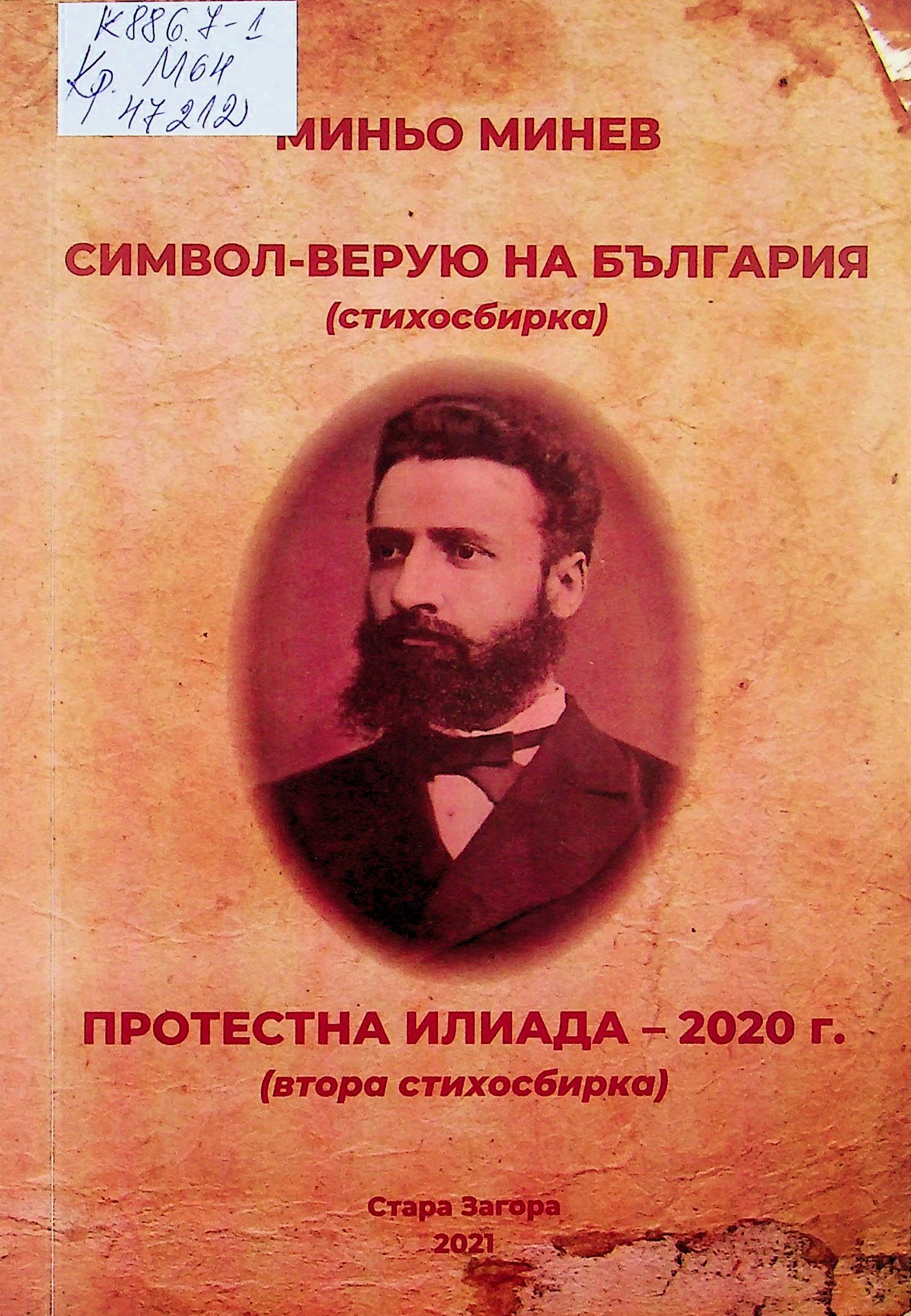 ЦБ 47212 МИНЕВ, Миньо Дончев Символ-верую на България : (Стихосбирка) ; Протестна Илиада - 2020 г. : (Втора стихосбирка) / . - Ст. Загора : Кота, 2021 (Ст. Загора : печ. Кота). - 109 с. ; 21 см Библиогр.: с. 97-98. ISBN 978-954-305-569-2 Сист. N: 154287 |