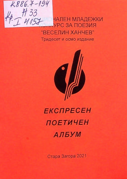 ЦБ I 4157 НАЦ. младежки конкурс за поезия "Веселин Ханчев". XXXVIII. Ст. Загора. 2021 Експресен поетичен албум : [Сб. наградени и отличени творби] / Худож. Ива Груева. - Ст. Загора : [Библ. Родина], 2021 ([Ст. Загора : печ. Библ. Родина]). - 24 с. : с ил. ; 15 см Съдържа стихове от : Р. Райкова, Б. Узунова, М. Петкова, Р. Апостолова, М. Рупчева, Т. Георгиева, К. Бешев, Г. Гълъбова, М. Игнатова, М. Русева, А. Стоева, Б. Славкова, П. Димитрова, В. Денев. - Организатори : Община Ст. Загора, Библ. Родина, Къща музей Гео Милев ; Жури на 38. изд. на конкурса : Камелия Кондова, Васил Б. Видински, Ина Иванова. - Връчване на наградите 17 дек. 2021, Ст. Загора. Сист. N: 158281 |